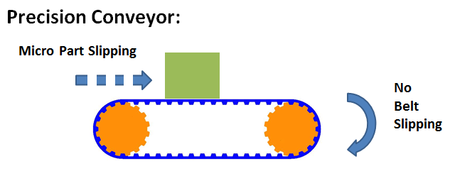 To understand the improvements of a precision conveyor you need to look first at the shortcomings of an industrial belt conveyor. An industrial belt conveyor is driven entirely by friction. The drive roller moves the belt by friction and the product moving on the belt also is held in place by friction. Due to these limitations when using these conveyors in an indexing or positioning application there can be micro slipping at both points. This slipping is caused by the inertia of the conveyor belt and product itself along with the application of Newton’s second law, “Objects at rest tend to stay at rest.” This slipping then causes inaccuracies in product location which limits its use for indexing applications.