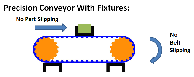 The Precision Conveyor with Fixtures provides the greatest degree of accuracy capable in a belted conveyor. It combines an accurate timing conveyor belt with an attachment system to locate fixtures along the length of the belt (see image below). The timing belt has virtually no stretch (less than 1 mm per meter of length), and the attachment system uses the tooth technology to provide placement accuracy of 0.005″. This belt system is controlled by conveyor end sprockets and an integrated servo gear motor. The combined system accuracy of the components along with the response time of the controller achieves a full package accuracy of +/-0.020″ at 100 indexes per minute.