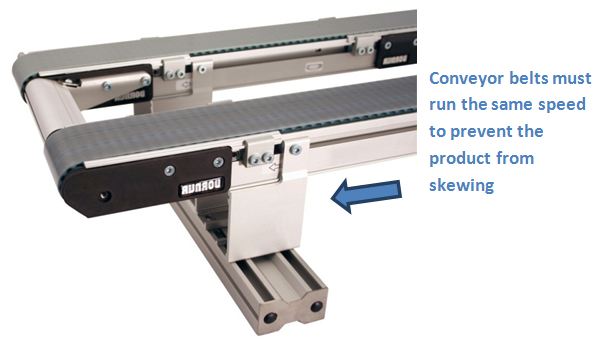 The problem with using Industrial Belt Conveyors in this application is there is no way to ensure that the two belts are running the same speed and it is possible for the product to skew as it runs down the length of the conveyor.  With Precision Conveyors the belts are positively driven and you are ensured that they will stay in time and at the exact same speed.
