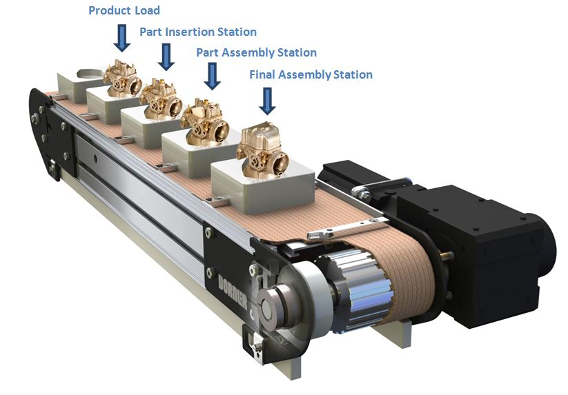 The high degree of accuracy along with the flexibility of the conveyor provides a platform that is well suited for automated assembly applications. In these applications multiple operations are taking place on a given product to generate the final assembly. These operations may include; robotic product loading, fastening, labeling, gluing, ultrasonic welding, wiring and testing. The operations are performed in a synchronous manner with a given distance between assembly stations. The Precision Conveyor indexes from station to station and is required to maintain a high degree of accuracy to work along with the assembly operations. At the last station a robot or operator removes the product from the fixture and the empty fixtures go back to the first operation attached to the return belt.