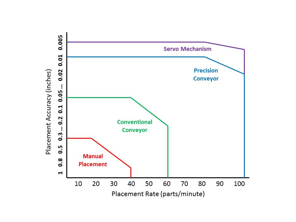The following chart illustrates the methods of product positioning and the associated precision or repeatability that can be accomplished at a specific cycle time. For example, the least precise method of product positioning is manual part placement. With manual part placement you can expect on average a +/-1/2″ repeatability with a cycle time of about 30 parts/min. The most precise method is a servo mechanism or pick and place. With the servo driven mechanism you can achieve on average +/- 0.010″ repeatability with a cycle time of 100 parts/min or more.
